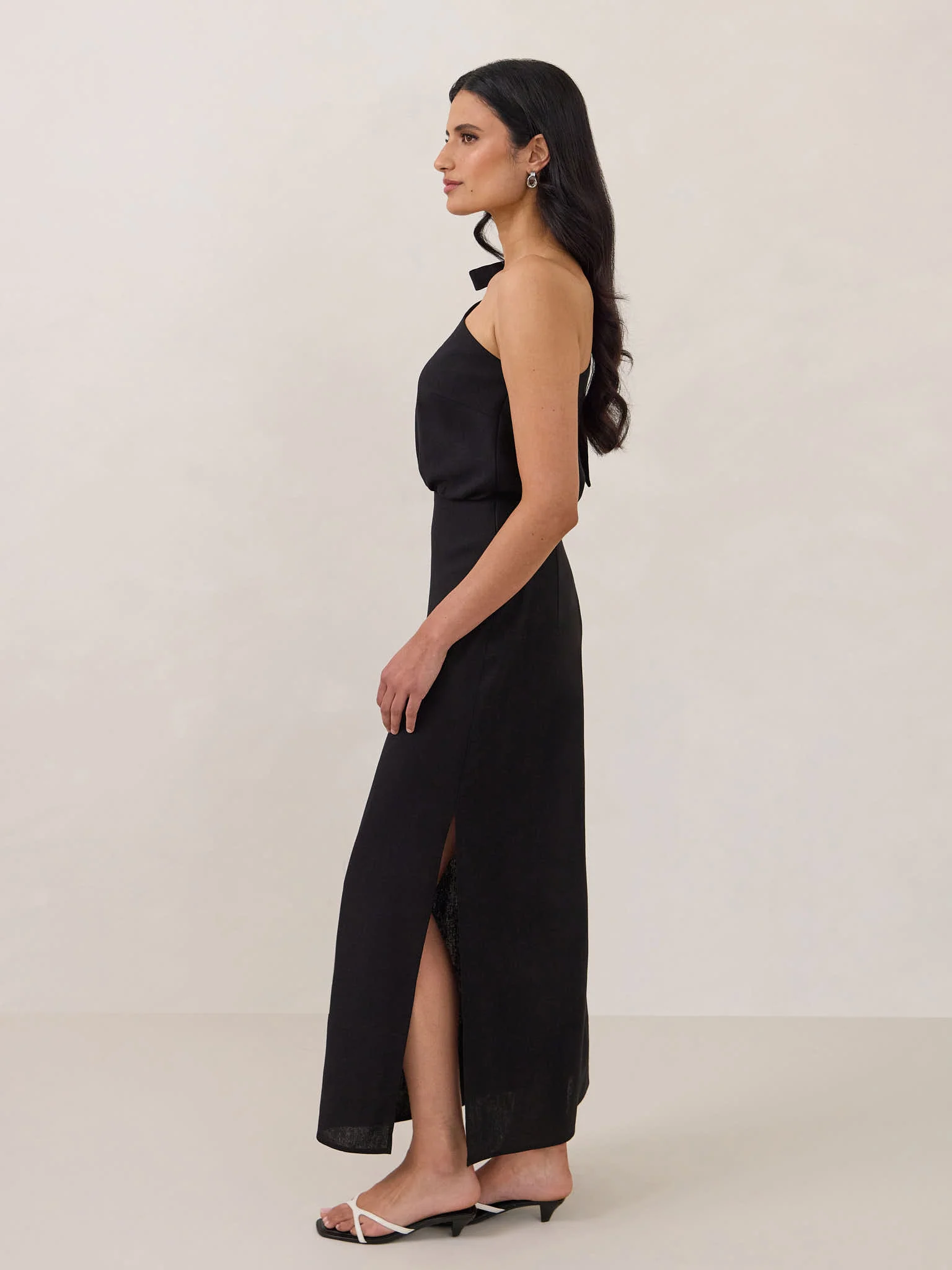 Understated, but far from simple. The Hudson Dress features a one-shoulder neckline with a soft tie detail and a slim-fitting skirt with a subtle side slit. A polished option for warm-weather events.