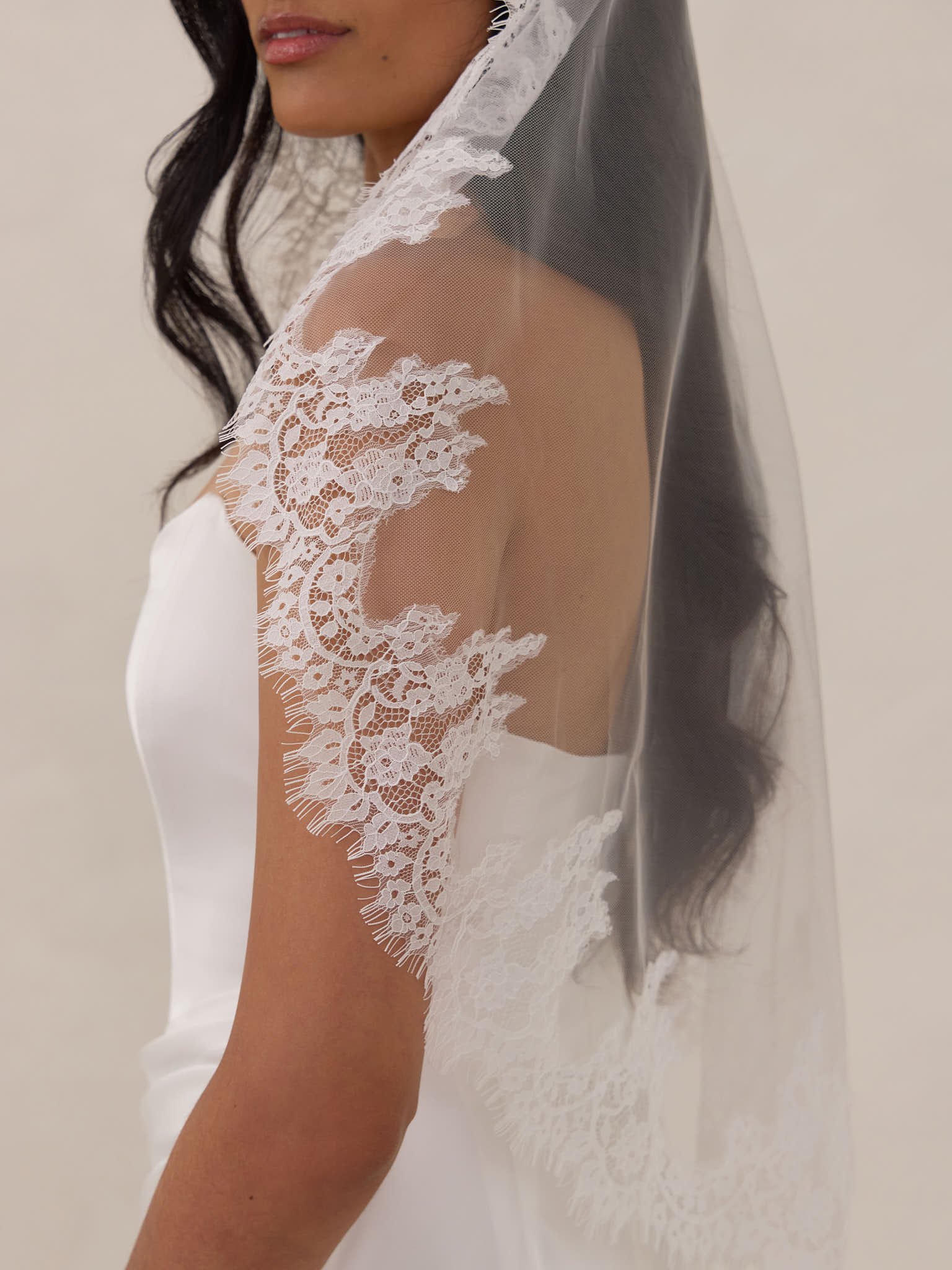 The Lisette Veil blends contemporary style and vintage charm with soft tulle and intricate lace. This mid-back length veil offers a sleek, modern silhouette with a vintage twist: detailed lace edging for timeless romance and subtle texture.