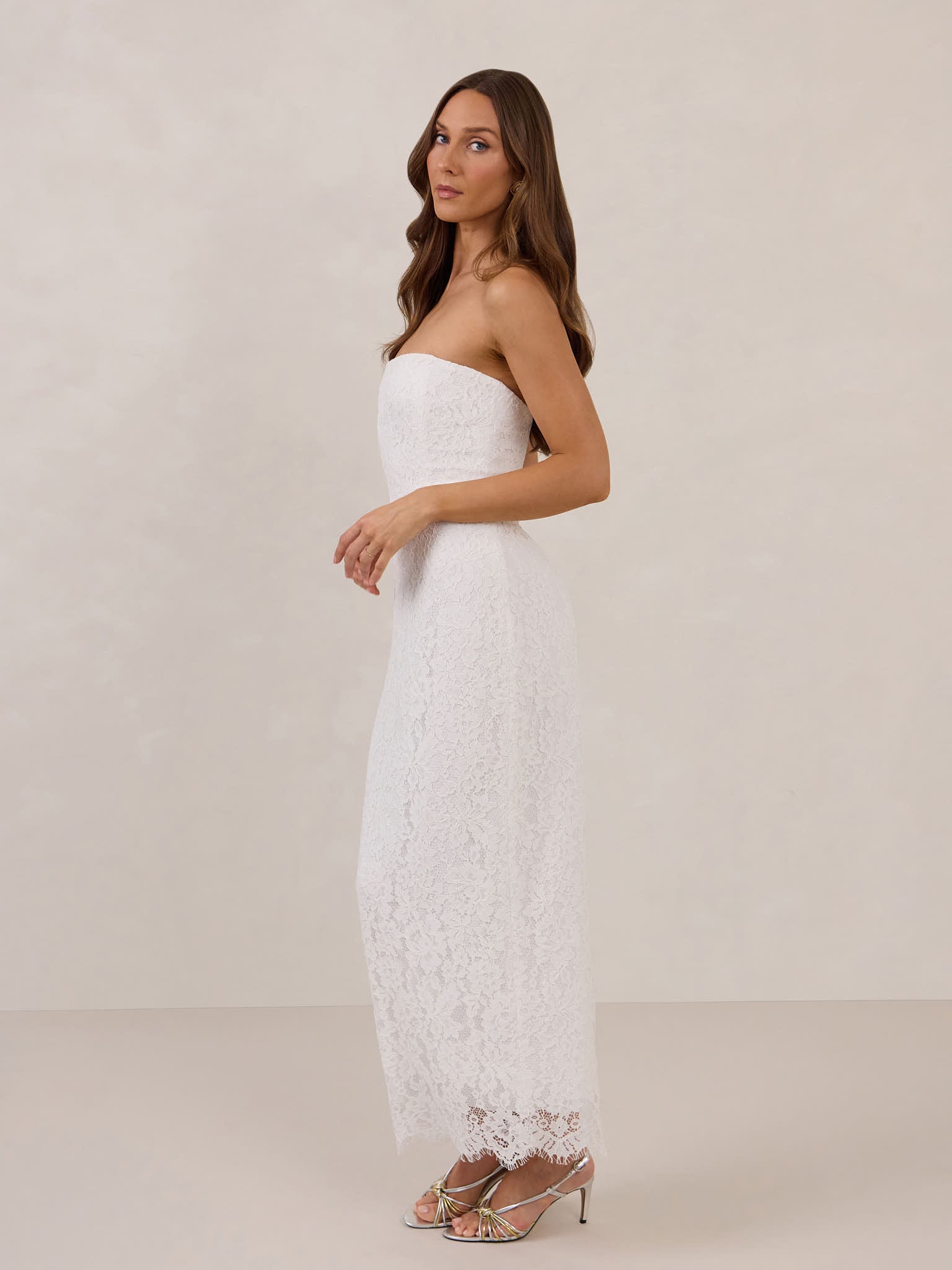 The Neve Dress is a refined take on lace—elegant, minimal, and made for modern bridal moments. Designed with a structured, boned bodice and slim-fitting midi skirt, it offers a flattering silhouette with just the right amount of detail.